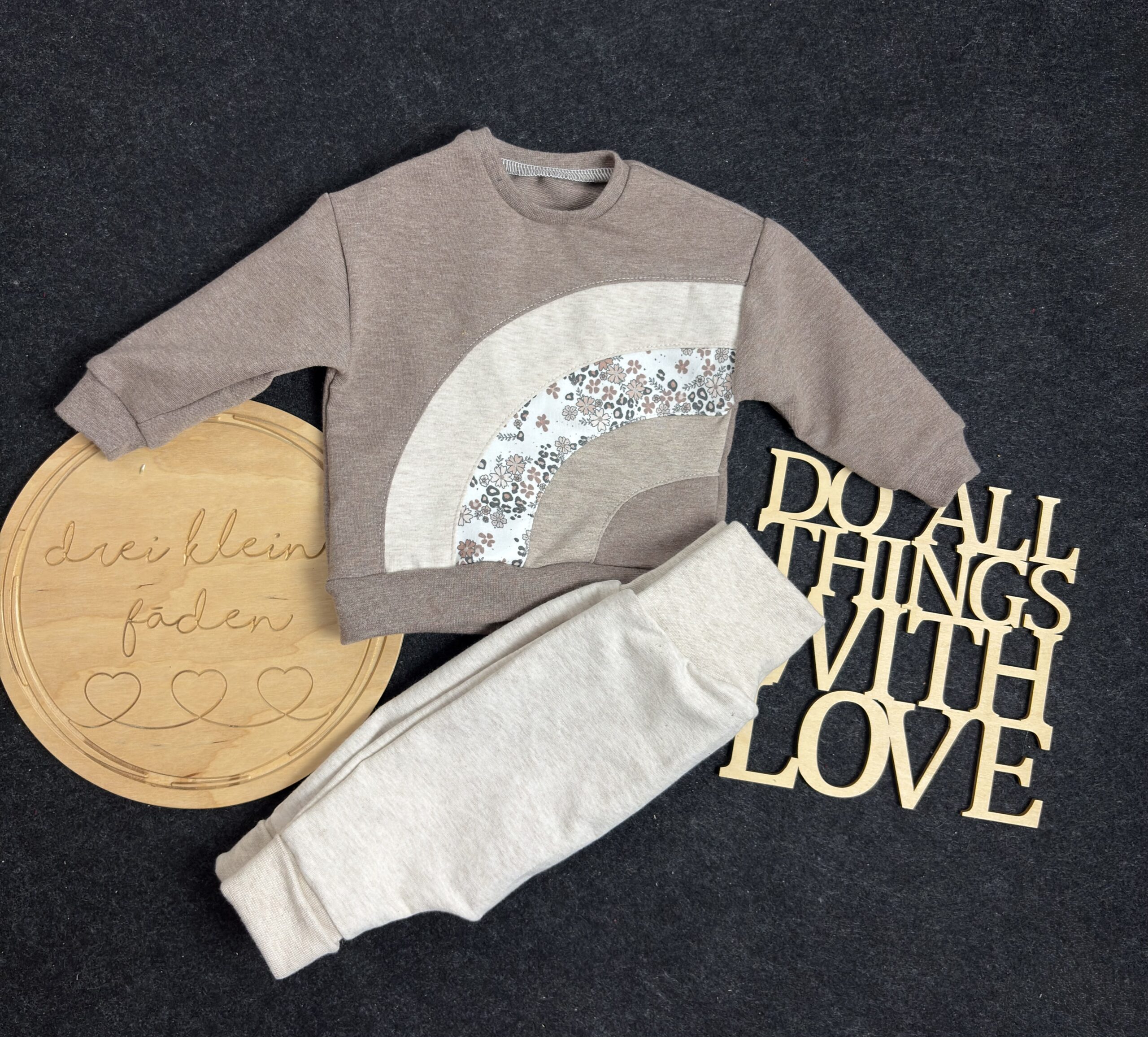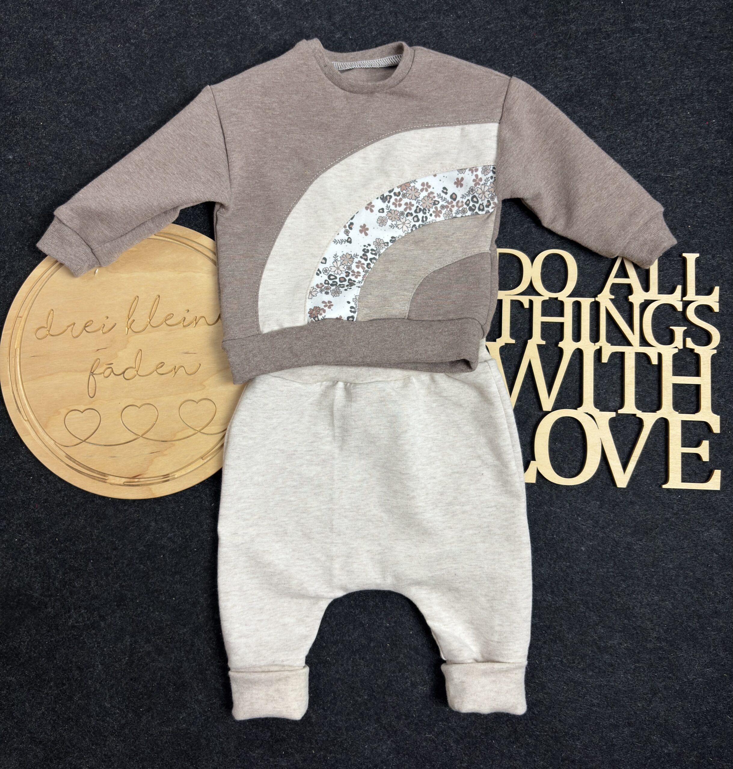 Diese bezaubernde Set ist ein echtes Lieblingsstück für kleine Babys. Das niedliche Regenbogen-Motiv macht das Set zu einem liebevollen Hingucker und sorgt garantiert für strahlende Augen. Durch die natürlichen Farben lässt sich die Hose aber auch der Sweater super mit anderen Farben kombinieren. Der Sweater hat am Hals eine Knopfleiste, dass der Sweater leicht zum an und ausziehen geht.