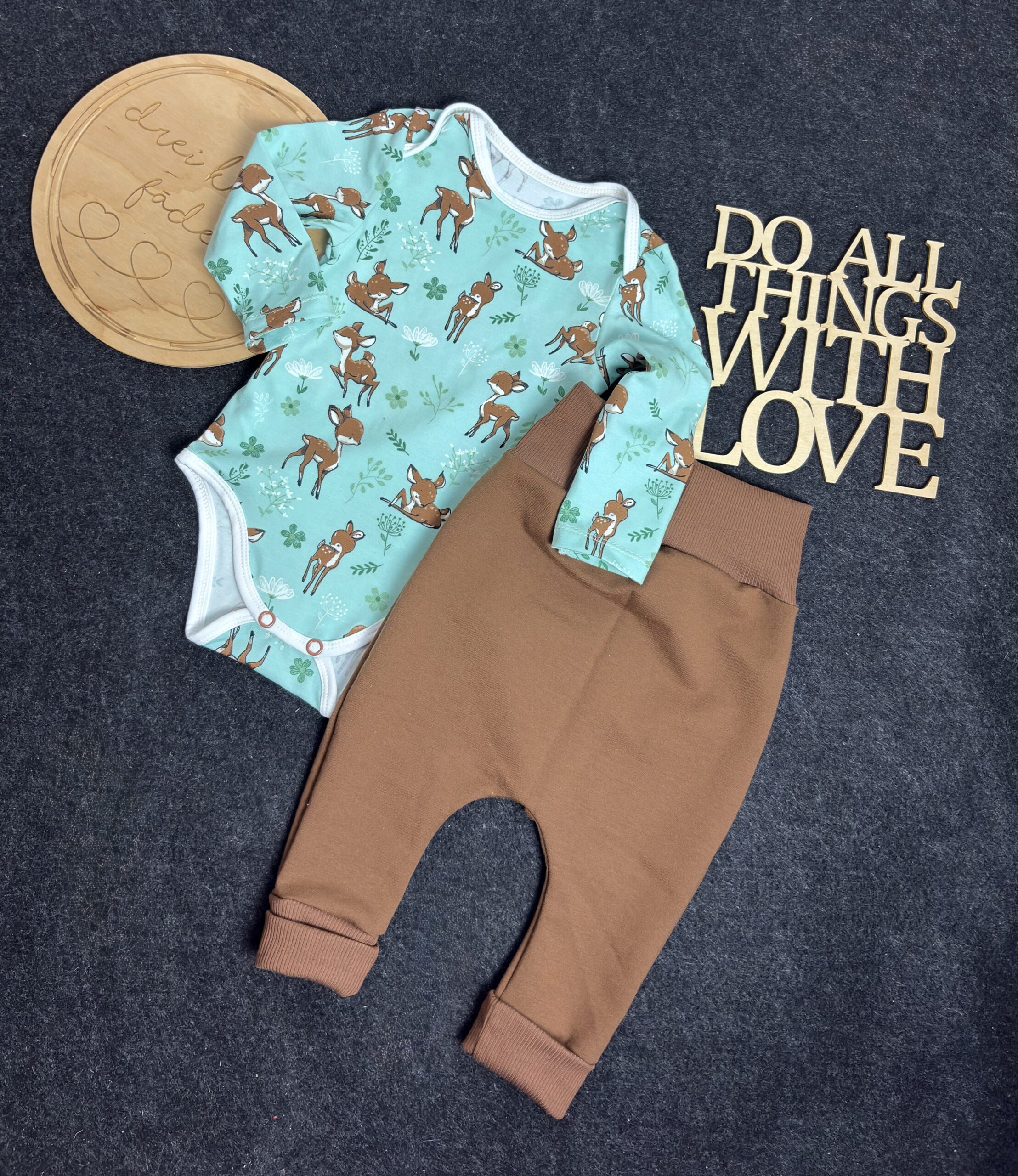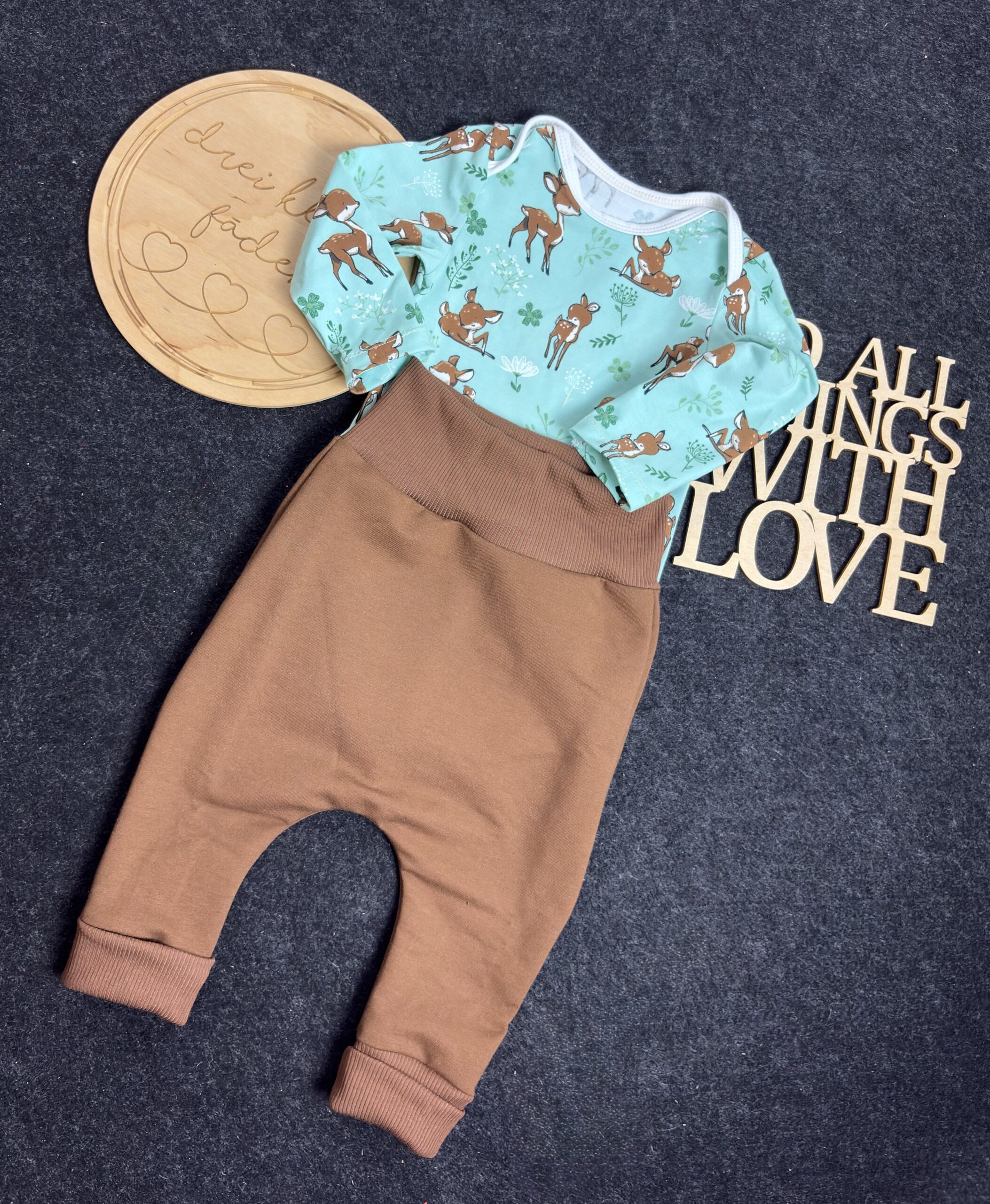 Dieses Outfit besteht aus einem weichen Body und einer dazupassenden Pumphose – gehalten in einem sanften braun-Ton.